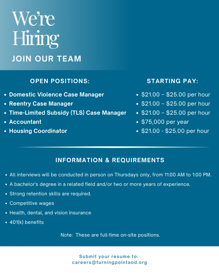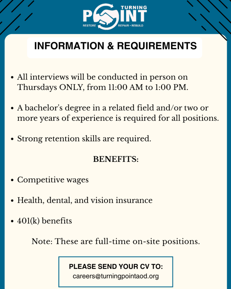 Careers Home / Careers Opportunities Current Job Openings Explore exciting opportunities to make a difference at Turning Point. We’re looking for passionate individuals committed to empowering communities and creating positive change. Be part of our journey today!